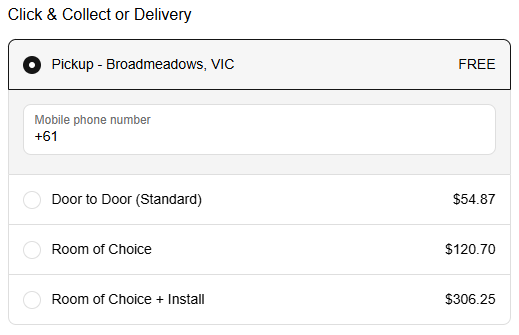 Our website offers delivery or pick-up. Pick-up is offered if our nearest store has available stock.